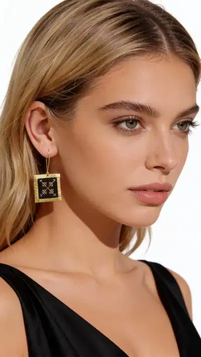 Make a sophisticated statement with these striking square drop earrings that beautifully blend traditional Greek embroidery artistry with contemporary design. The rich black textile foundation is meticulously hand-embroidered with intricate geometric motifs in lustrous gold thread, creating an eye-catching interplay of light and shadow that moves gracefully with every turn of your head.