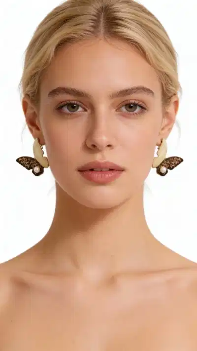 These enchanting butterfly stud earrings capture the delicate beauty of nature with their whimsical design and lustrous freshwater pearls. Each earring features an intricately crafted brass butterfly silhouette with detailed wing patterns that catch and reflect light beautifully, creating subtle movement and visual interest.