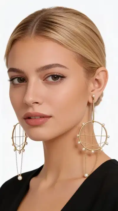 Crafted with meticulous attention to detail, each earring features a substantial circular hoop adorned with intersecting brass wires that form an artistic lattice pattern. Genuine freshwater pearls are strategically positioned within this golden grid, creating mesmerizing light play and movement with every turn of your head. Delicate brass chains cascade gracefully below, adding fluid motion and extending the earrings' dramatic silhouette for maximum impact.