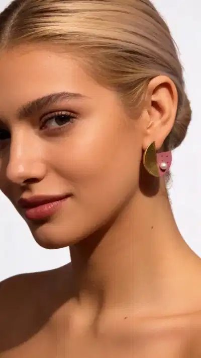 These striking stud earrings showcase a perfect harmony of contemporary design and timeless elegance, featuring lustrous freshwater pearls nestled within polished gold-plated brass crescents. The sophisticated color palette combines warm golden tones with soft pink and creamy pearl white accents, creating an eye-catching geometric composition that elevates any ensemble.