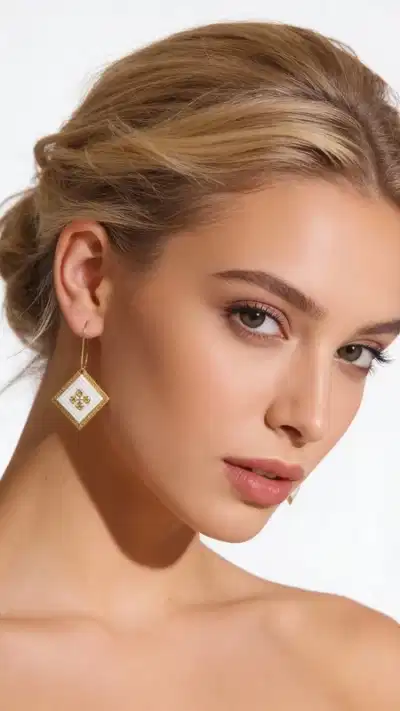 These striking diamond-shaped drop earrings showcase the perfect marriage of traditional Greek embroidery and contemporary jewelry design. Each earring features pristine white textile adorned with intricate geometric patterns, meticulously hand-stitched with gleaming gold thread that catches and reflects light with every movement.