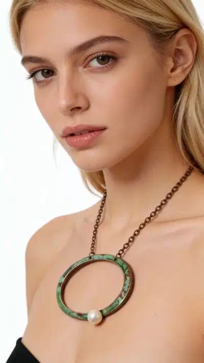 Discover the captivating allure of this statement necklace that seamlessly blends ancient Greek artistry with contemporary fashion sensibilities. The striking circular pendant showcases an oxidized copper design with a mesmerizing green patina finish, creating an organic, weathered beauty that speaks to centuries of Mediterranean craftsmanship.