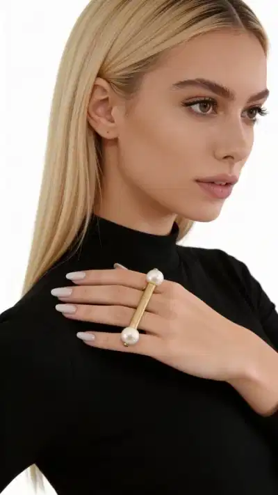 Make a bold statement with this extraordinary long stick pearl ring that redefines contemporary elegance. The sleek golden bar gracefully spans across your finger, creating an elongated silhouette that's both modern and timeless, while two lustrous freshwater pearls positioned at each end add a touch of classic sophistication.