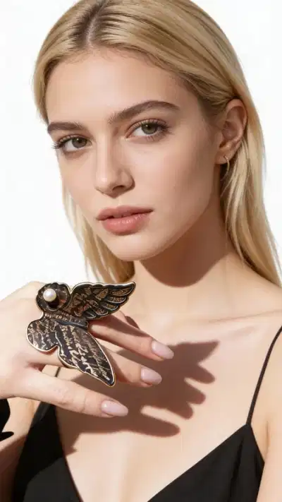 This extraordinary butterfly statement ring captures the enchanting beauty of transformation with its intricate winged design and lustrous freshwater pearl centerpiece. The meticulously crafted brass construction features an antique finish that highlights every delicate detail of the butterfly's wings, creating depth and visual interest that catches light beautifully.